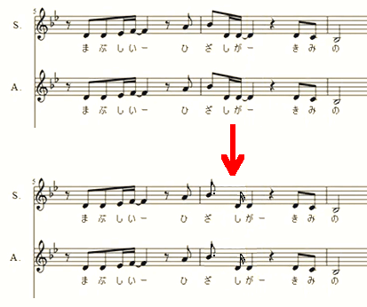 校内の合唱大会で、音楽の先生が指導した3年生の合唱で、本来の楽譜(上)ではなくて、(下)のように歌っていることがありました。