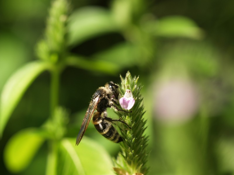 > こちらは今朝の撮影。タデの花とハチ。