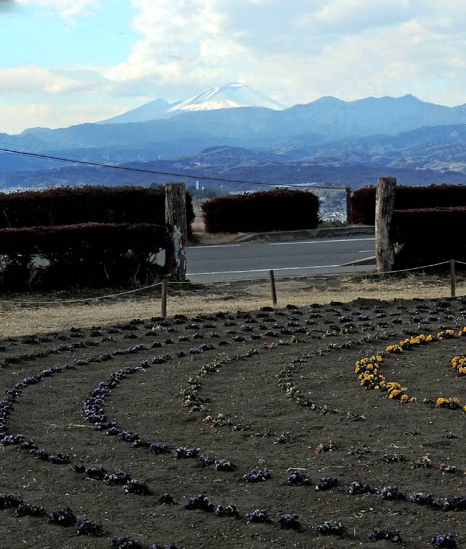 ビオラ(だと思う)が同心円で植えてあるのは「展望花の丘」という施設の花壇です。 さすがに自宅の庭からは浅間山を含むパノラマの展望はありません。