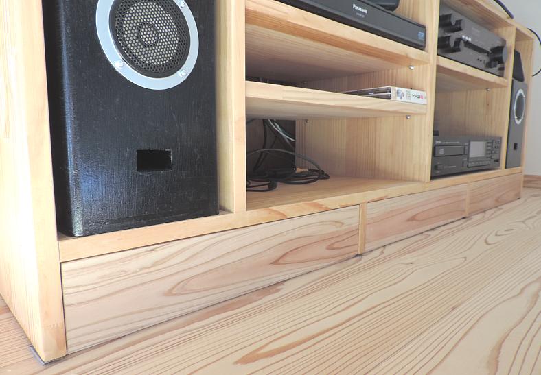 材料がTV台の集成材がなくて新築の余り板を使ったので床の続きみたいに見えますが。