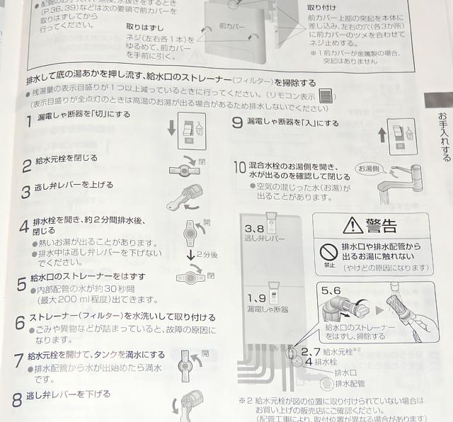 年に2、3回の点検と水抜き掃除は、入居後、1年10カ月で初めてやりました。 これでも、手順が複雑でマニュアルを地面に置いてやってたら、吹き出した水でマニュアルが濡れてしまいました。